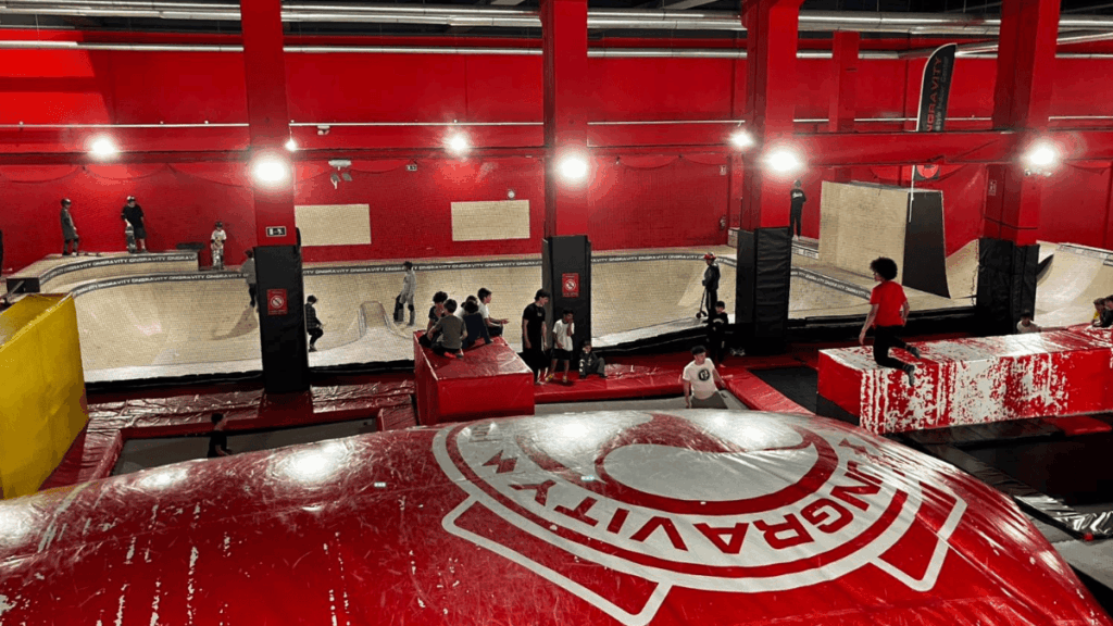 Dentro del espacio encontrarás diferentes zonas: área de parkour, telas aéreas, zona de skateboard, circuito de scooter o las clássicas camas elásticas